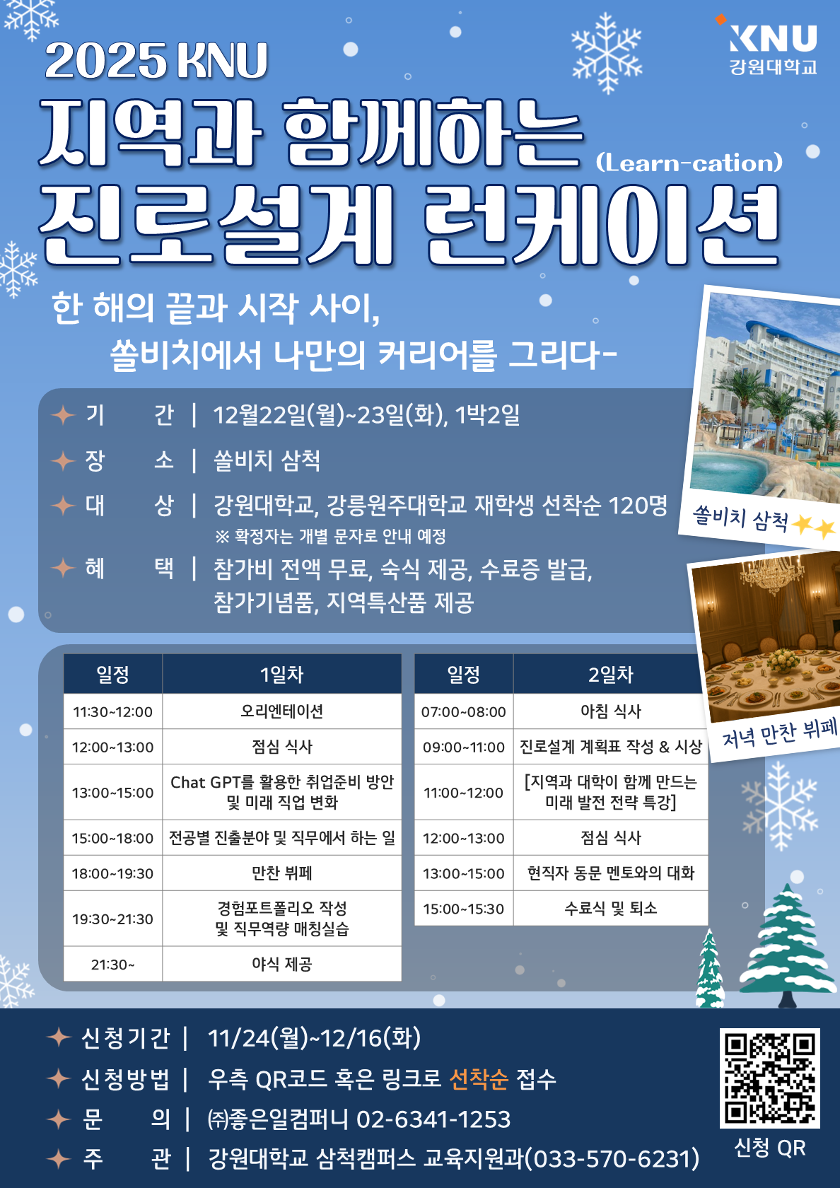채용 트랜드 이해와 개인 맞춤식 진로설계를 통해 취업 경쟁력을 향상시키고 지역에 대한 이해와 통합강원대 구성원으로서의 공통체 의식을 함양하기 위하여 ‘2025 KNU 지역과 함께하는 진로설계 런케이션’ 프로그램을 아래와 같이 운영하오니 재학생들의 적극적인 참여 바랍니다.