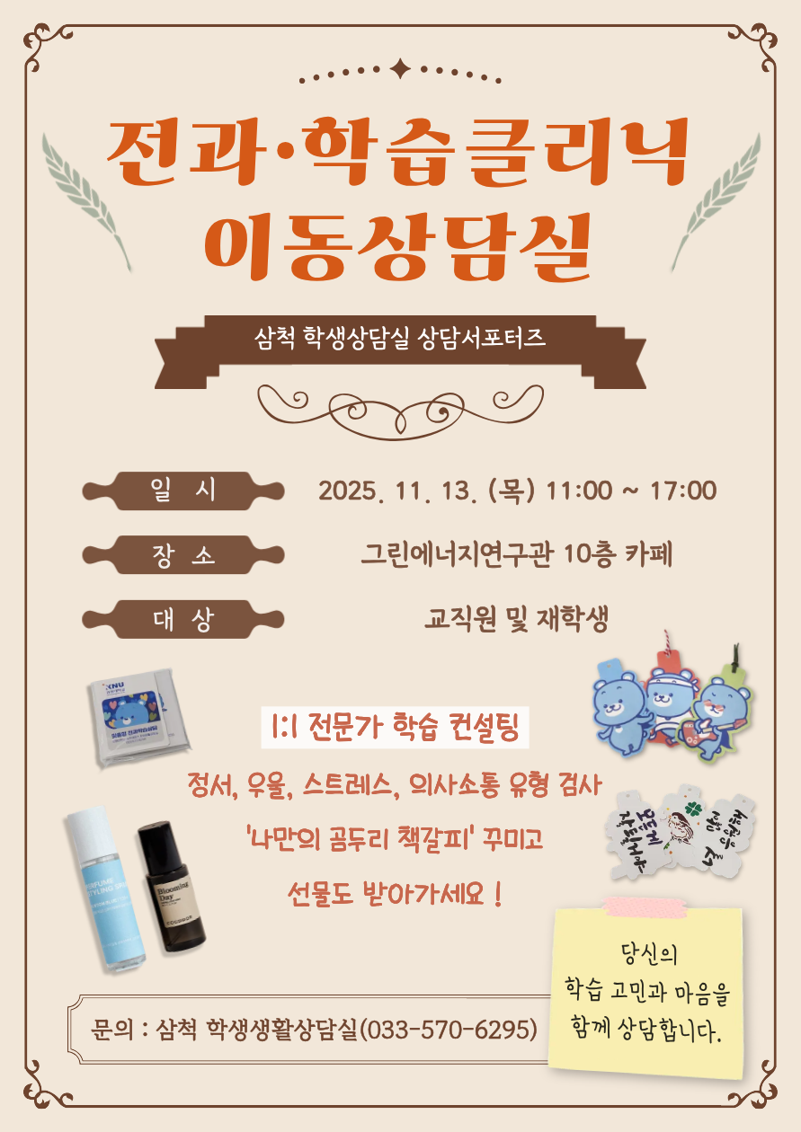 1. 학생생활상담실은 2025년 글로컬 사업 일환으로 재학생의 성공적인 전공선택·변경지원을 위해 전과학습클리닉 사업을 운영하고 있습니다.